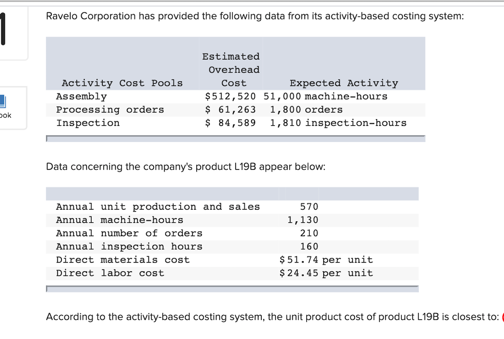 Data concerning the companys product L19B appear below. Activity Cost Pools Estimated Overhead Cost Expected Activity Assembly 503520 46500 machine-hours Processing orders 56763 1350 orders Inspection 80089 1360 inspection-hours Data concerning the companys product L19B appear below. Ravelo Corporation has provided the following data from its activity-based costing system.