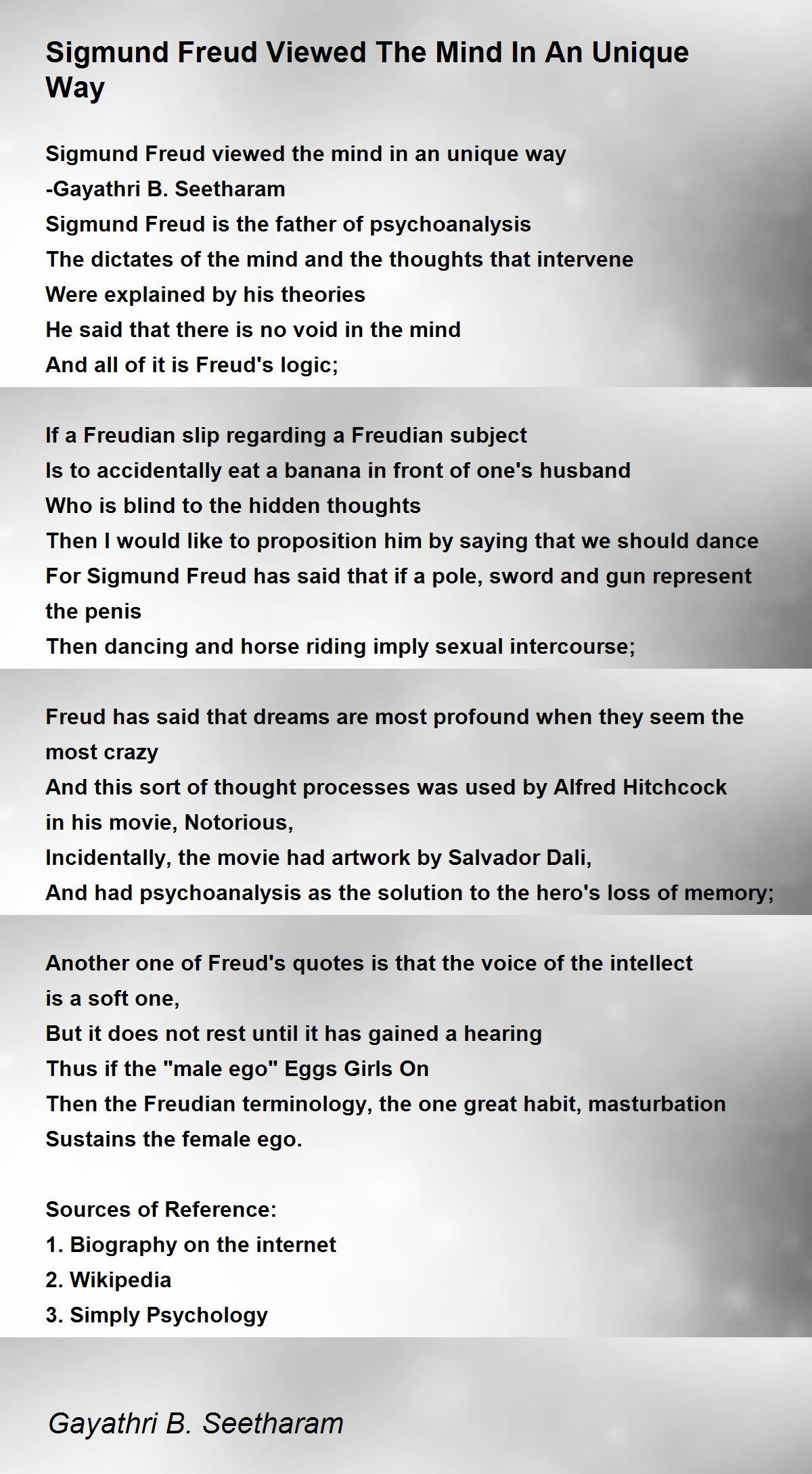 When domesticity for instance is called drudgery all the difficulty arises from a double meaning in the word. How to create a catchy title for an essay do work essay to for cited page How common problems in writing essays sigmund freud philosophy about self essay thyroid disorder case study essay topics on hamletTruman show film review essay essaye de ne pas rire jeux video. The University of Adelaide Library is proud to have contributed to the early movement of free eBooks and to have witnessed their popularity as they grew. Nicole Kidman the Australian actress caused controversy when she lit up at the Cannes Film Festival. Sigmund Freud felt that anxiety stems from hidden feelings impulses socially inappropriate desires and emotional conflicts and issues from childhood. The author wrote dozens of novels and short stories over the course of his life including Adventures of. Sometimes a cigar is only a cigar We had a good friend who was a psychologist and she named her dog Siggy Ha.